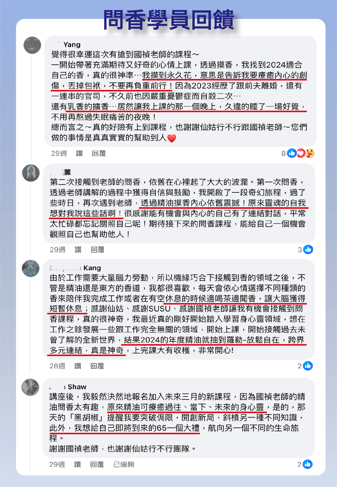 在我人生最低谷時,國禎老師透過精油療癒我,給予我巨大的信心與支持。他運用乳香,賦予我勇氣與力量。這些年來,我們合作舉辦多場VIP會員活動,幫助大家透過精油與珠寶創造美好能量,勇敢面對生命挑戰。無論順境逆境,心靈都能保持平靜與喜悅。我強烈推薦國禎老師的課程,幫助您認識自己,活出豐盛人生!